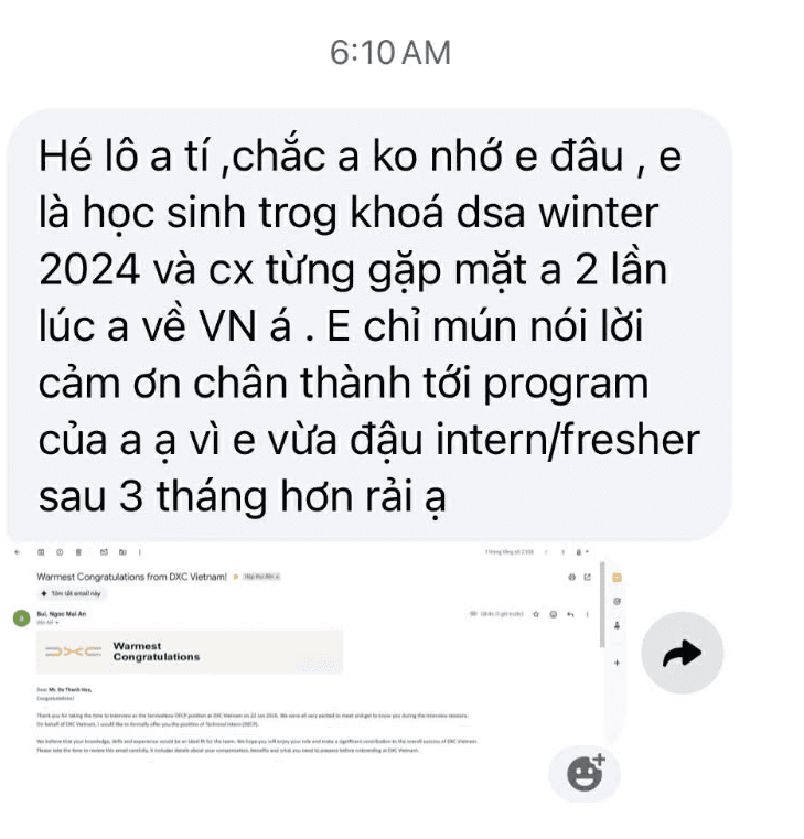 “DSA đã giúp Tí đậu vào những công ty hàng đầu về công nghệ, Tí mong các bạn cũng có thể học và làm hơn những gì Tí đã làm.”